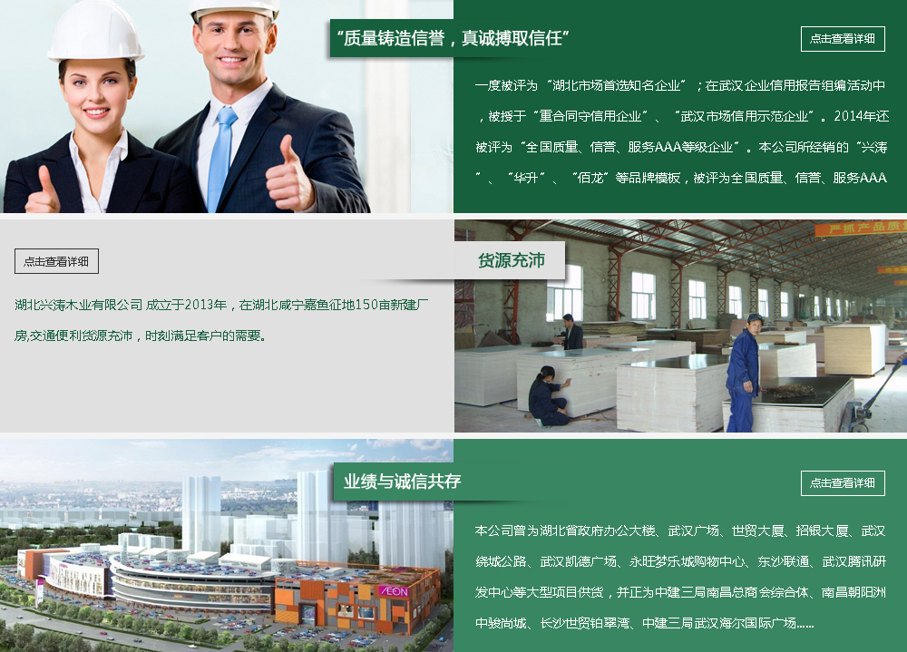 湖北興濤木業(yè)有限公司成立于2013年,在湖北咸寧嘉魚征地150畝新建廠房,公司立足于武漢地區(qū),業(yè)務(wù)輻射湖北及周邊地區(qū),多年來致力于木枋、模板批發(fā)業(yè)務(wù),公司以“質(zhì)量鑄造信譽,真誠搏取信任”為宗旨,以多品種、低價格、優(yōu)質(zhì)量深受廣大客戶的青睞,是一家在木枋模板行業(yè)中處于優(yōu)秀地位的廠家。公司一度被評為“湖北市場知名企業(yè)”;在武漢企業(yè)信用報告組編活動中,被授于“重合同守信用企業(yè)”、“武漢市場信用示范企業(yè)”。2014年還被評為“全國質(zhì)量、信譽、服務(wù)AAA等級企業(yè)”。本公司所經(jīng)銷的“興濤”、“華升”“佰龍”等品牌模板,被評為全國質(zhì)量、信譽、服務(wù)AAA等級品牌模板。